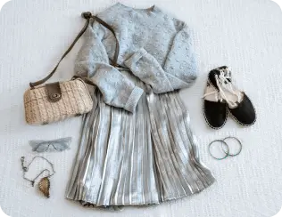 Silver tones and cozy textures! A soft gray sweater pairs perfectly with a metallic pleated skirt. Finish with neutral sneakers, a textured bag, and simple accessories for understated elegance.